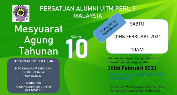 Dengan hormatnya perkara di atas dirujuk. Sukacita dimaklumkan bahawa Persatuan Alumni UiTM Perlis, Malaysia akan mengadakan Mesyuarat Agung ke 11 seperti yang dibenarkan oleh Jabatan Pendaftaran Pertubuhan Malaysia (ROS) dan mengikut prosedur operasi standard (SOP) yang telah dikeluarkan.