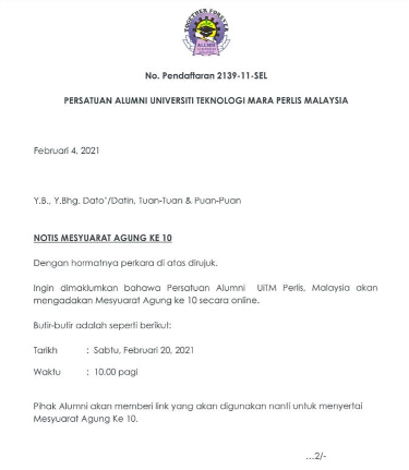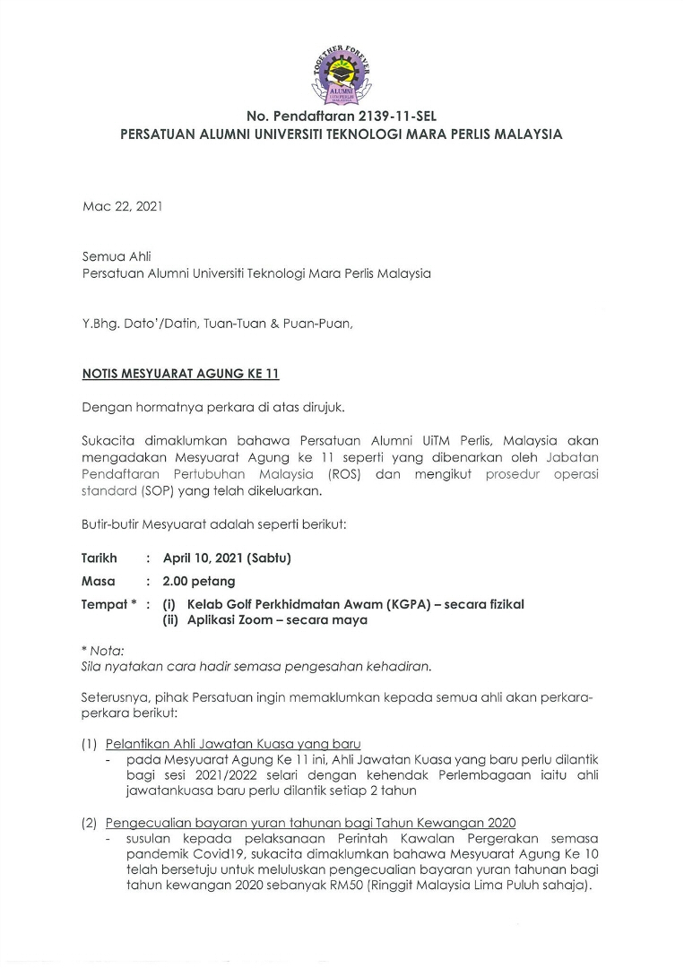 Dengan hormatnya perkara di atas dirujuk. Sukacita dimaklumkan bahawa Persatuan Alumni UiTM Perlis, Malaysia akan mengadakan Mesyuarat Agung ke 11 seperti yang dibenarkan oleh Jabatan Pendaftaran Pertubuhan Malaysia (ROS) dan mengikut prosedur operasi standard (SOP) yang telah dikeluarkan.
