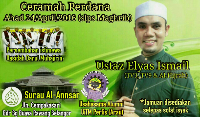 Ceramah Perdana. 24 Apr 2016 Surau Al-Annsar, Bandar Sg Buaya, Rawang. Penceramah Ustaz Elyas Ismail.