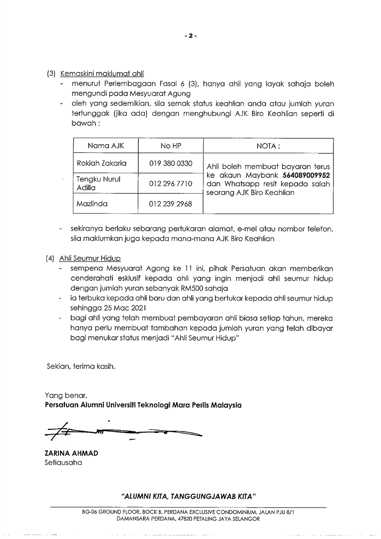 Ingin dimaklumkan bahawa Persatuan Alumni UiTM Perlis, Malaysia akan mengadakan Mesyuarat Agung Tahunan ke 10 secara online. Butir-butir adalah seperti berikut seperti lampiran surat rasmi ini.
