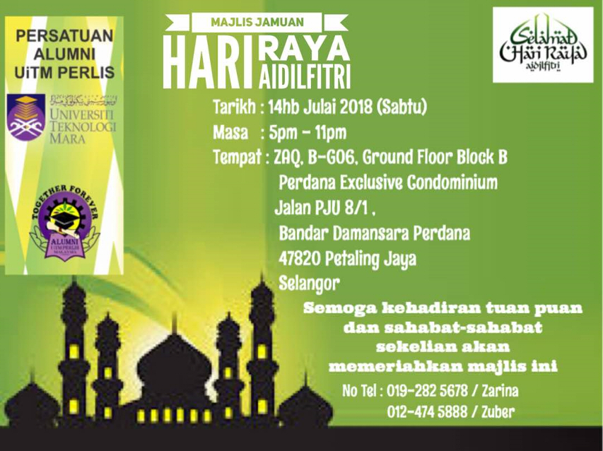 Persatuan Alumni UiTM Perlis Malaysia telah akan menganjurkan Majlis Sambutan Aidilfitri & Silaturrahim seperti berikut